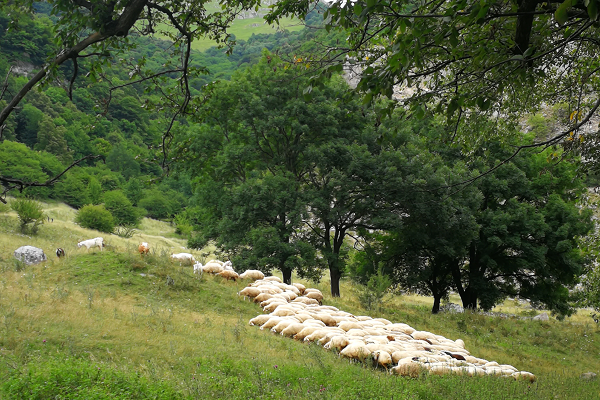 (Our farmer's sheep, grazing on the clean grasses of the Ossetian mountains. These herds roam these rolling hills all day.)