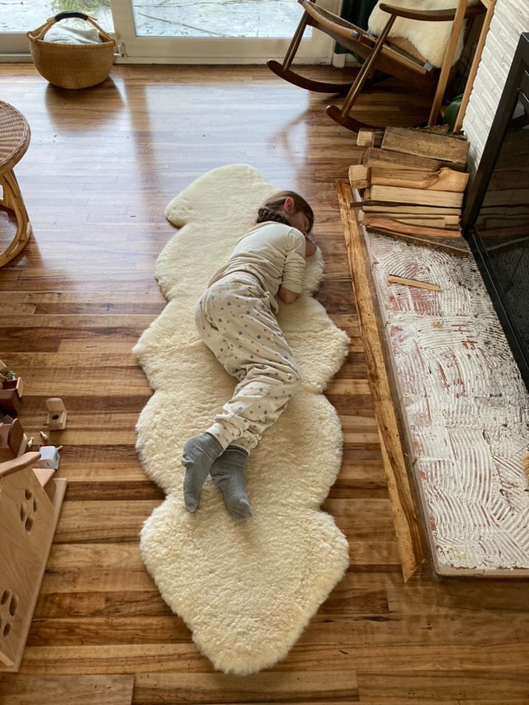 A truly rare double rug, made from our gorgeous thick shorn ivory sheepskin hides. Because the fur is shorter on this double sheepskin rug, it makes for an amazing sleeping mat, exercise pad, bench throw, cover for your couch, or fireside throw.