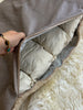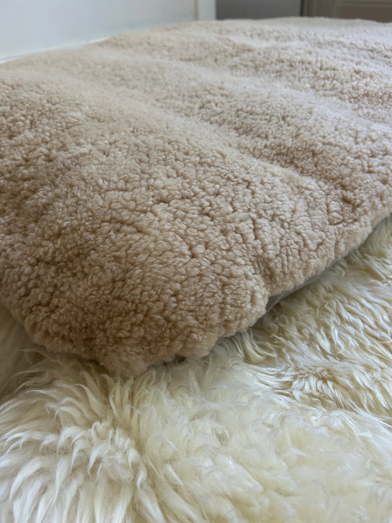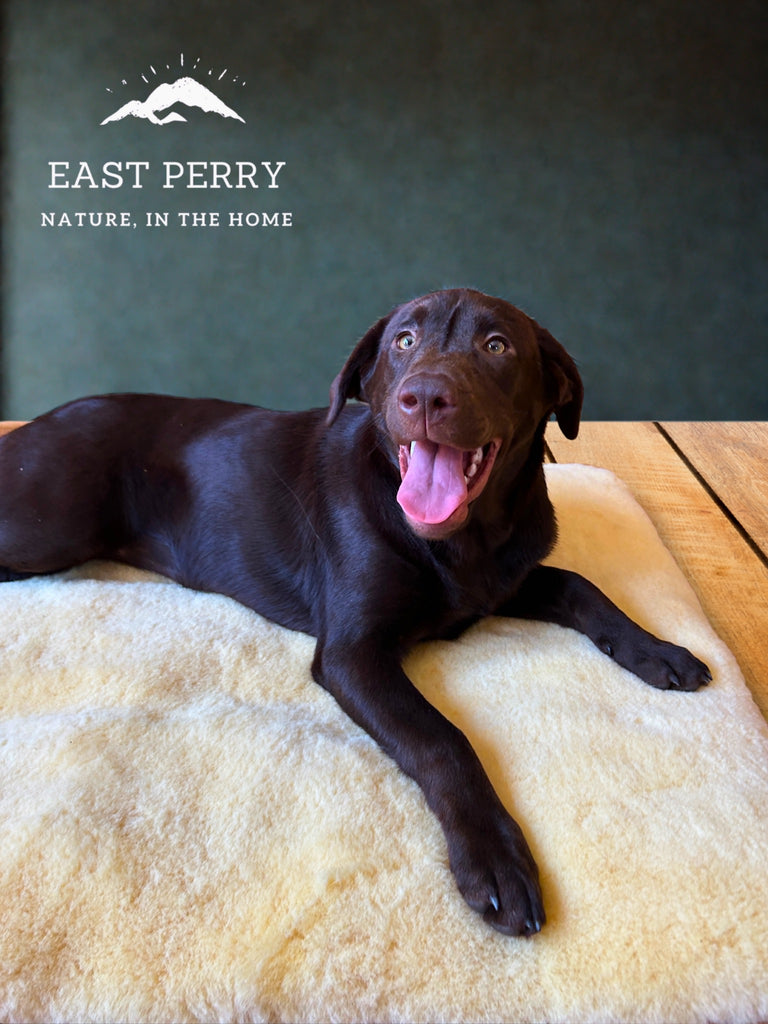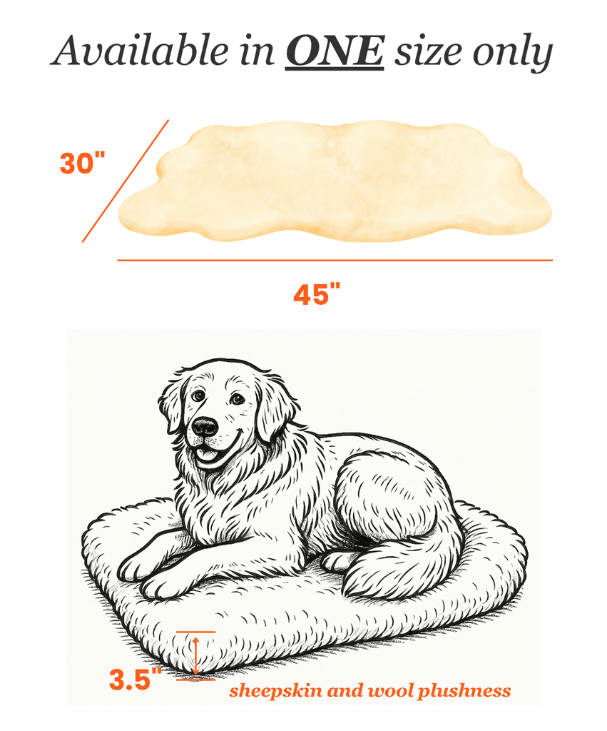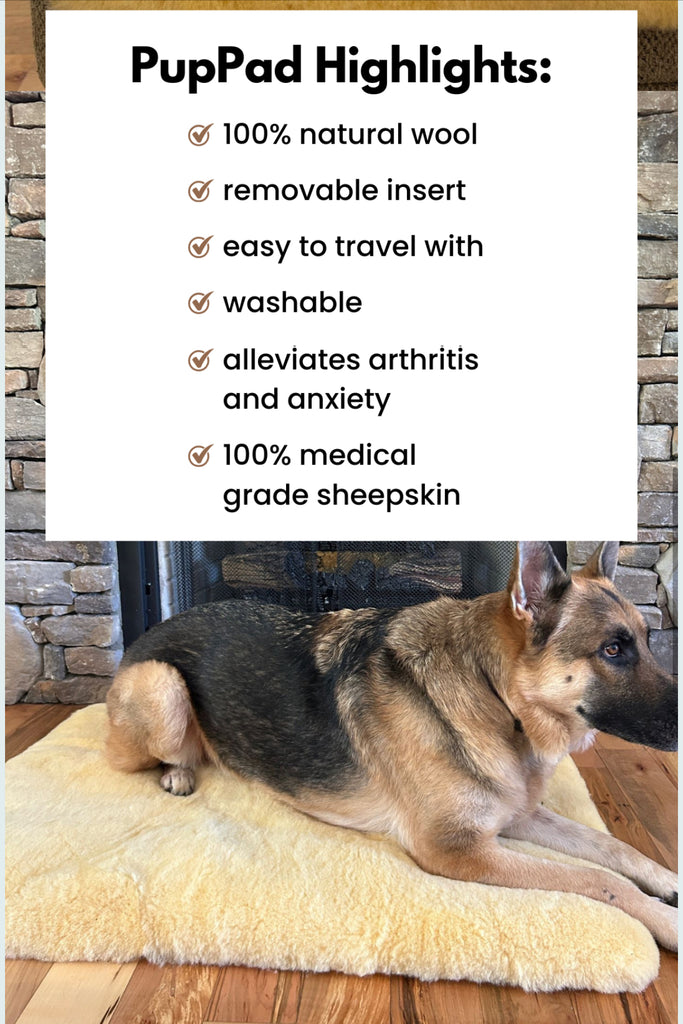 An orthopedic sheepskin dog bed, stuffed with a 100% natural wool removable pillow insert, making this bed fully washable. Designed with a soft yet durable microsuede bottom for added stability and comfort on any surface. Perfect for senior pups or larger dogs who need the healing touch of medical-grade sheepskin and wool.
